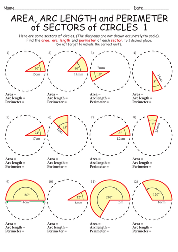 Printable math worksheets arc length and area of a sector